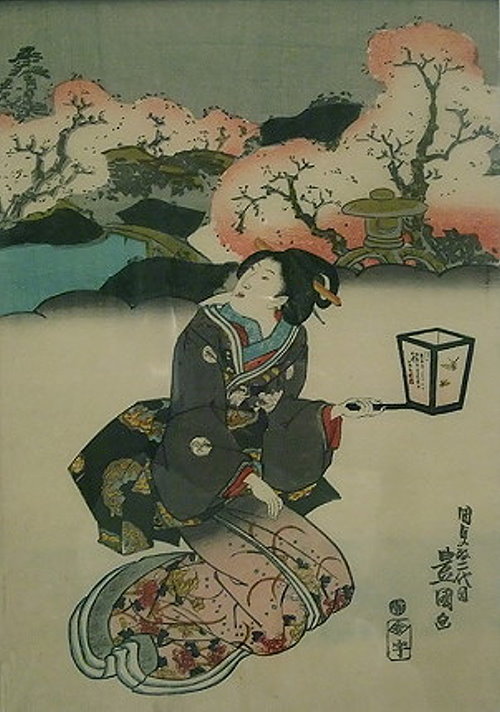 Fiori eleganti, luna e neve. Una donna con lanterna volge il suo sguardo all’indietro. Sullo sfondo alcuni ciliegi. Parte sinistra del trittico, che raffigura una scena notturna