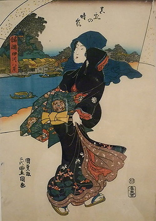 In questa serie di Kunisada la parte superiore raffigura un grande ventaglio, visibile nella sua intierezza solo accostando gli otto fogli, mentre nella parte inferiore vi sono vari soggetti di ispirazione che noi potremmo definire “romantica”.